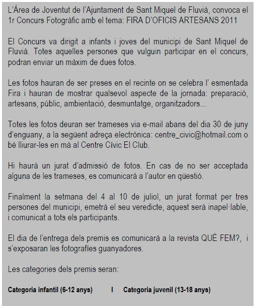 Convocatòria del 1r concurs de fotografies amb motiu de la fira d’Oficis de 2011.