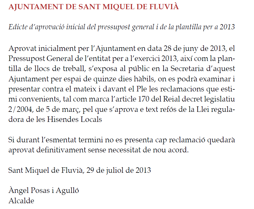 Edicte publicat al Butlletí Oficial de la Província de Girona en data 8 d’agost de 2013