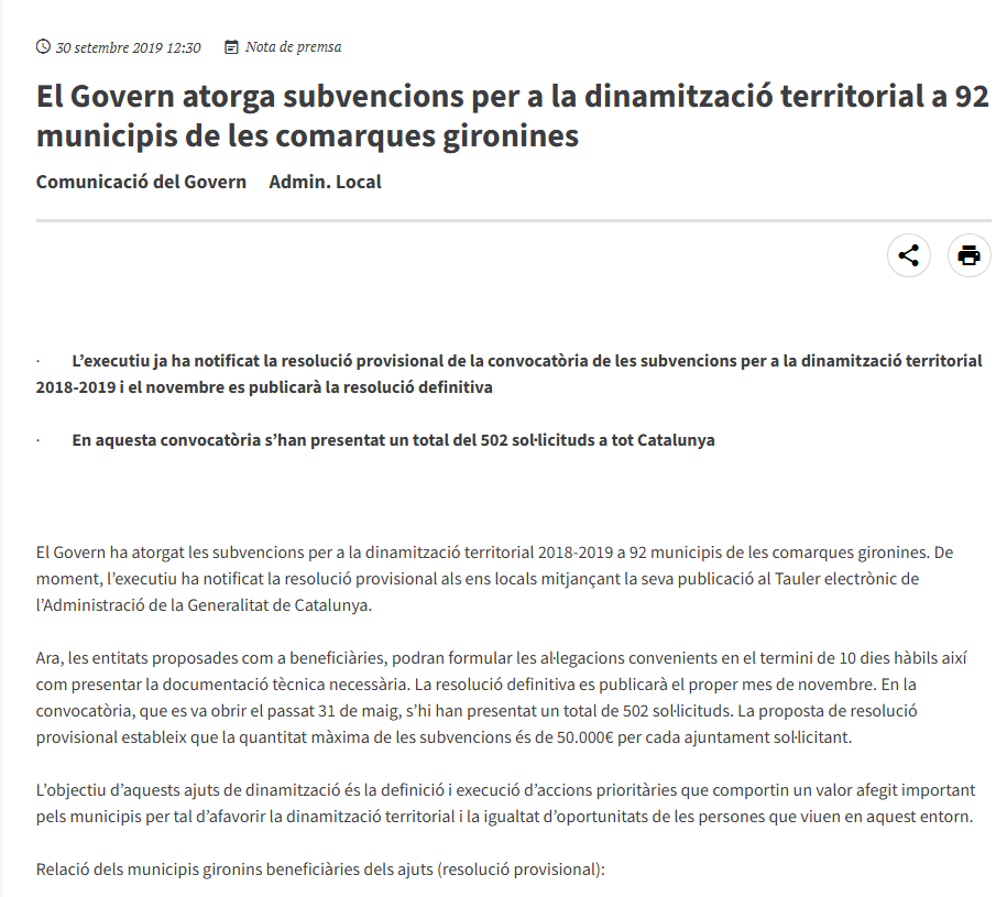 Nota de premsa del Govern Català publicada en data 30 de setembre de 2019.