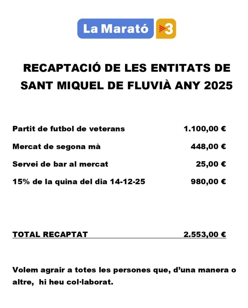 Informació de la recaptació per La Marató de TV3 de les diferents activitats organitzades a Sant Miquel de Fluviá.
