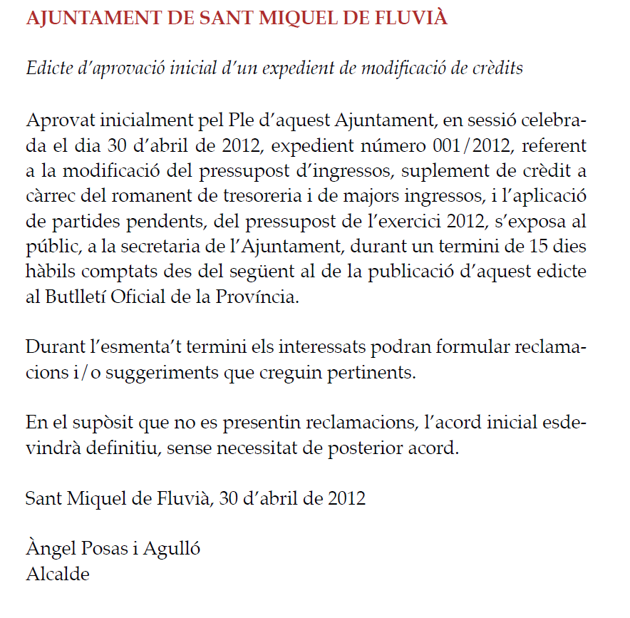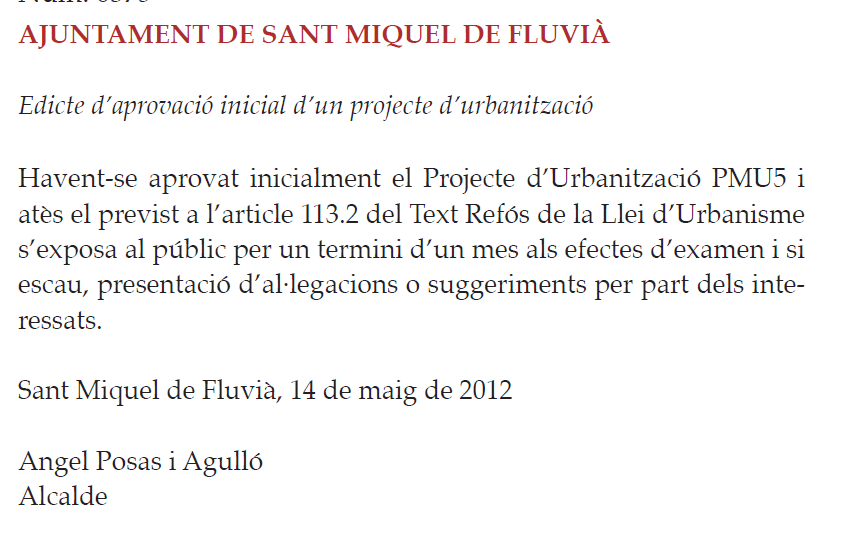 Edicte publicat al Butlletí Oficial de la Província de Girona en data 3 d’agost de 2012.