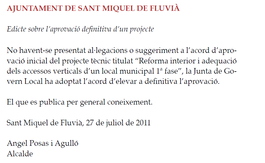 Edicte publicat al Butlletí Oficial de la Província de Girona en data 10 de febrer de 2011.