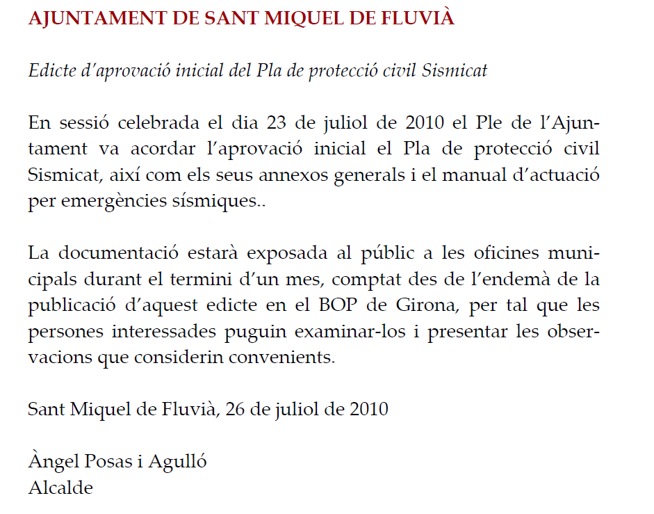 Edicte publicat al Butlletí Oficial de la Província de Girona en data 9 de febrer de 2010.