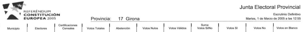 Notícia publicada al BOP (Butlletí Oficial de la Província) respecte als resultats del Referèndum de la Constitució Europea del 1r de març de 2005.