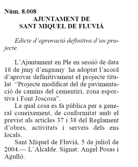 Edicte publicat al Butlletí Oficial de la Província de Girona en data 11 de juliol de 2004.