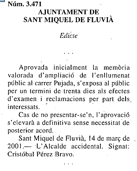 Edicte publicat al Butlletí Oficial de la Província de Girona en data 11 de juliol de 2001.