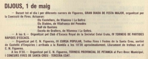 Notícia publicada al diari Los Sitios de Gerona en data 1 de maig de 1980; programa dels actes de la Fira de la Santa Creu de Figueres.