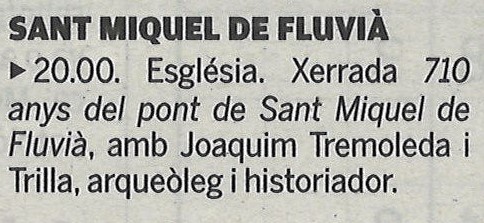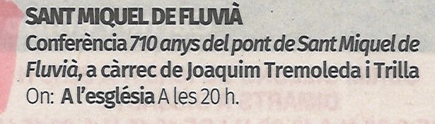 Cartell de la xerrada sobre “710 anys del pont de Sant Miquel de Fluvià” feta per en Joaquim Tremoleda, en motiu del 5è aniversari de l’associació Sant Miquel de Fluvià, un record per la memòria , el 8 d’agost de 2025.